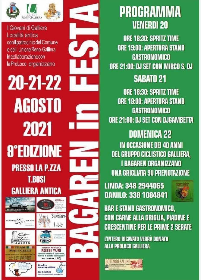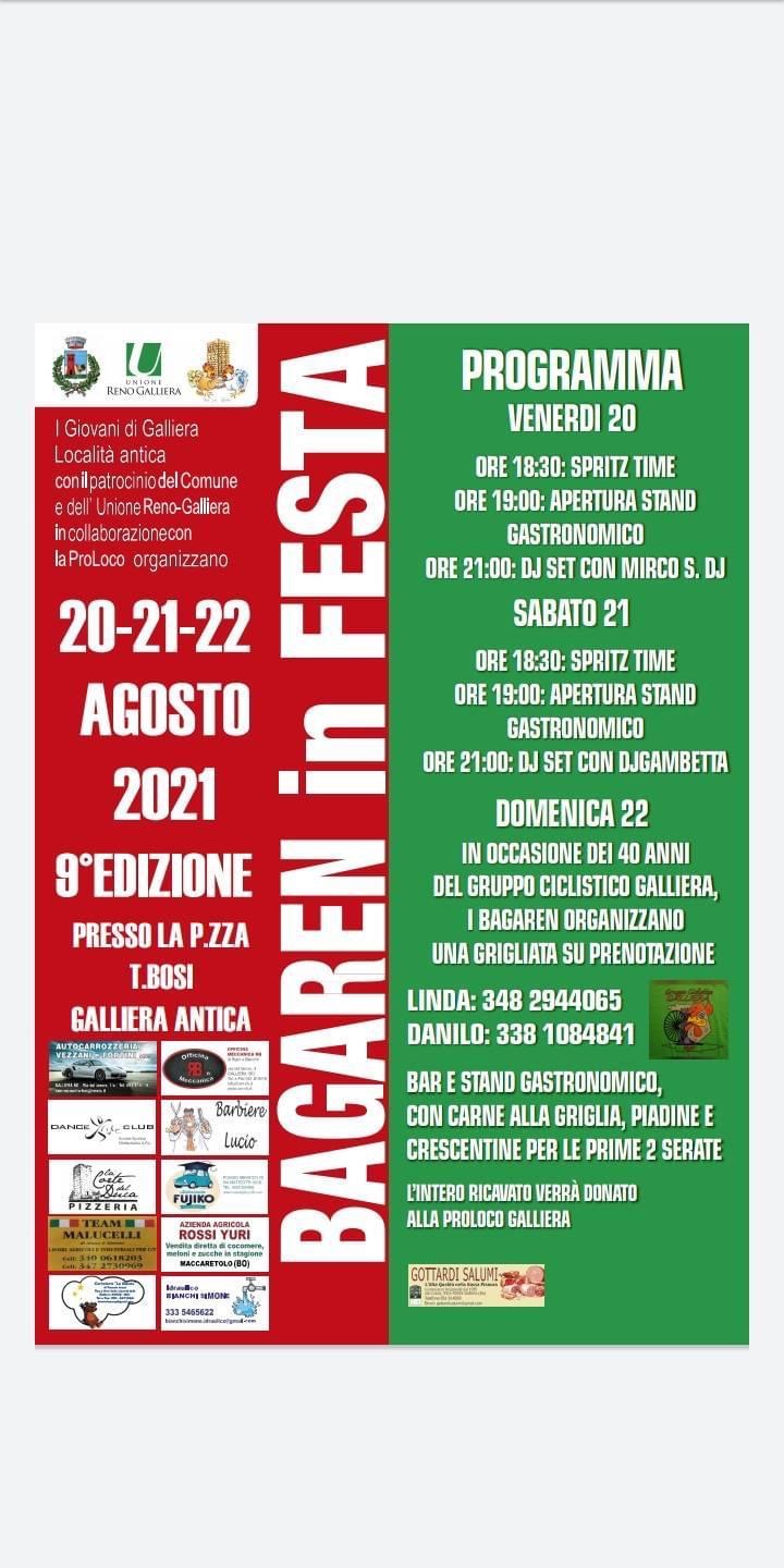 In data 20 – 21- 22 agosto 2021 presso Piazza Torino Bosi - Galliera Località Antica, si svolgerà la manifestazione denominata I "BAGAREN IN FESTA"