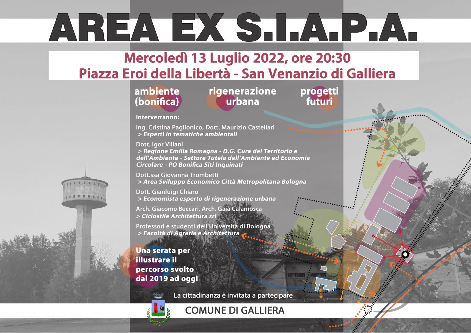 Una serata informativa sull’area ex-SIAPA che si terrà Mercoledì 13 luglio alle ore 20:30 in Piazza Eroi della Libertà a San Venanzio di Galliera.