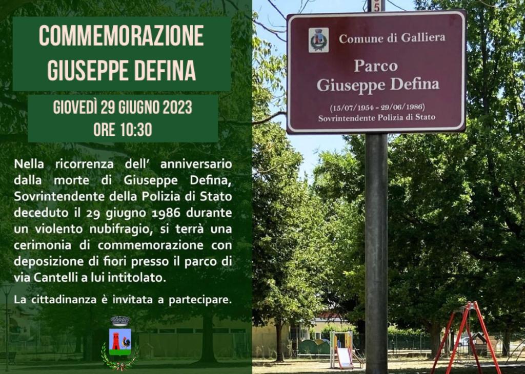 Nella ricorrenza dell’ anniversario dalla morte di Giuseppe Defina, Sovrintendente della Polizia di Stato deceduto il 29 giugno 1986 durante un violento nubifragio, si terrà una cerimonia di commemorazione con deposizione di fiori presso il parco di via Cantelli a lui intitolato.