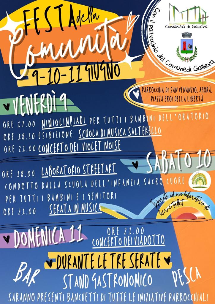 La Comunità di Galliera vi aspetta per tre giorni di festa dal 9 al 11 giugno presso la Parrocchia di San Venanzio, i locali dell'Agorà e Piazza Eroi della Libertà.