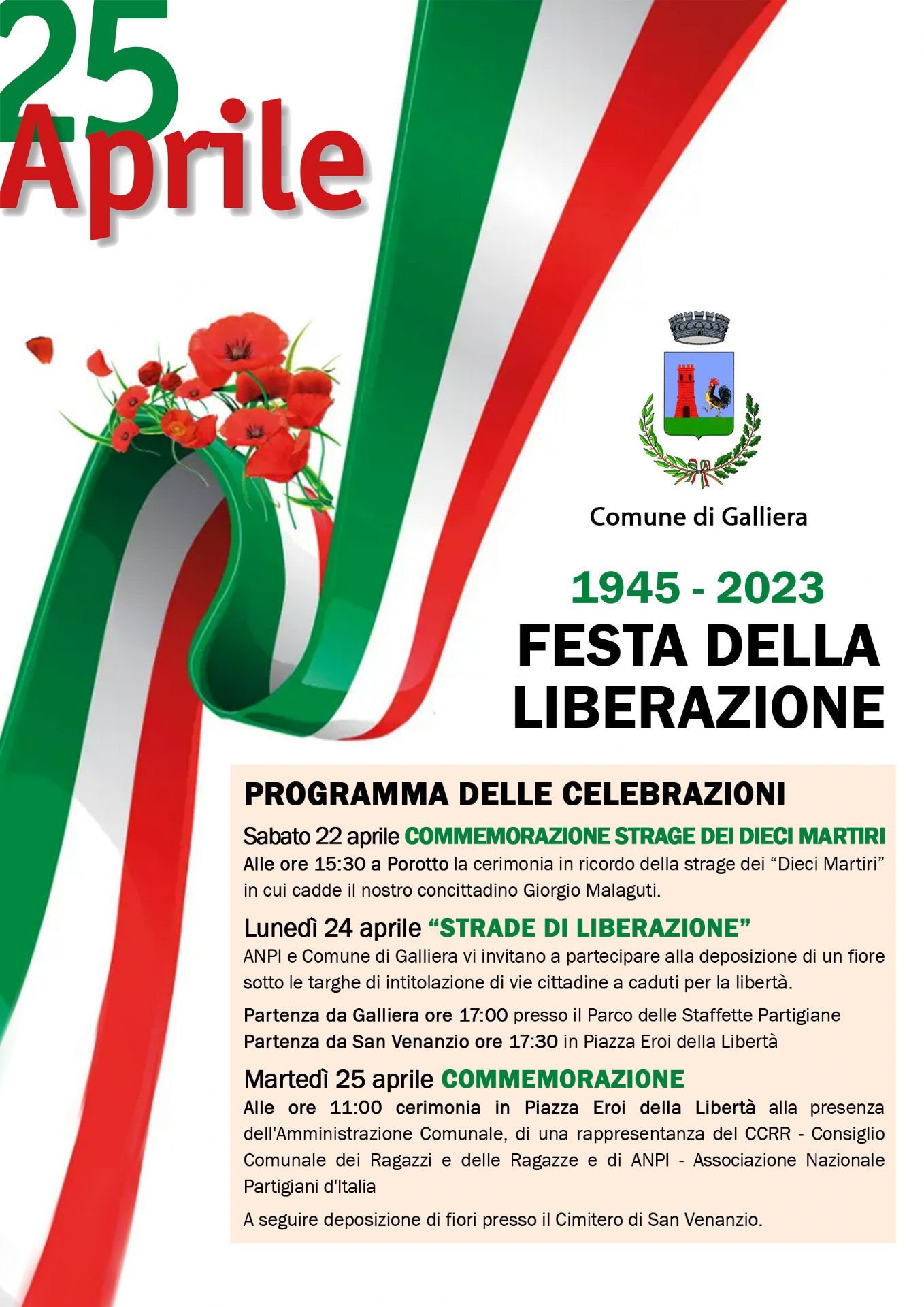 Alle ore 11:00 cerimonia in Piazza Eroi della Libertà alla presenza dell'Amministrazione Comunale, di una rappresentanza del CCRR - Consiglio Comunale dei Ragazzi e delle Ragazze e di ANPI - Associazione Nazionale Partigiani d'Italia.