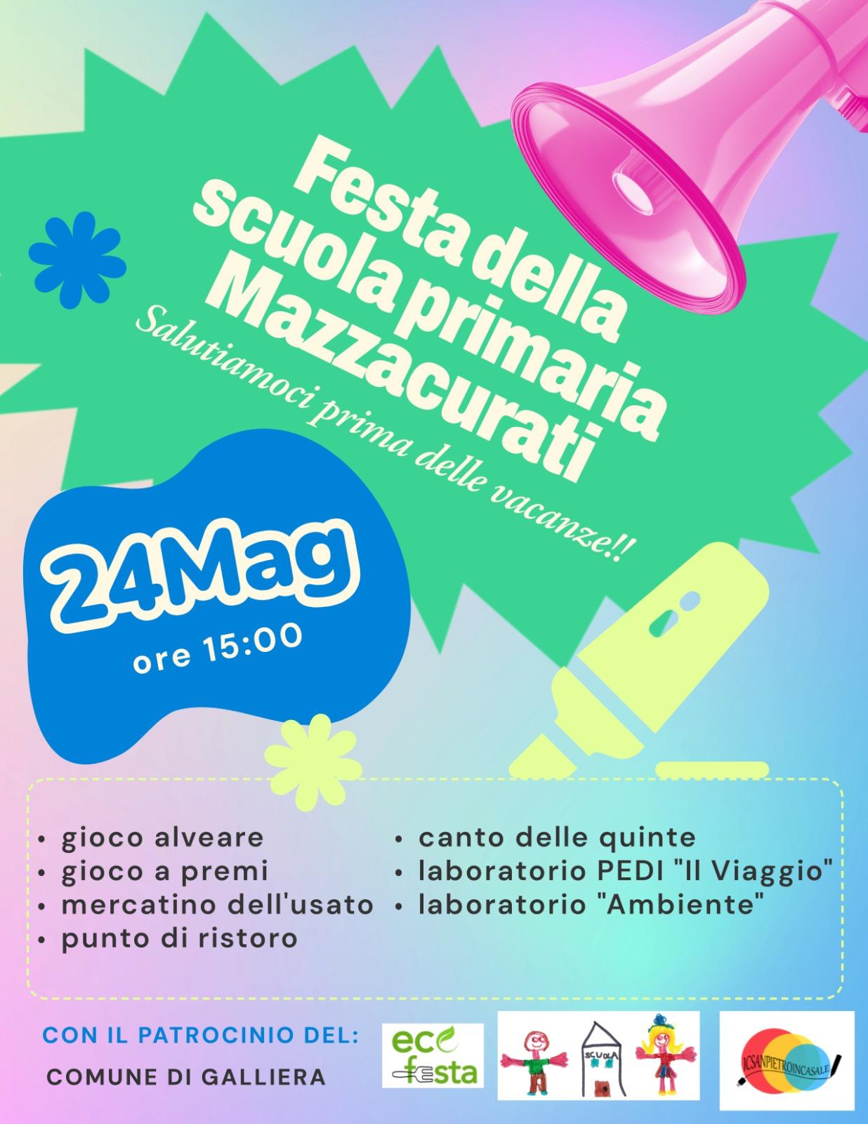 Sabato 24 maggio dalle ore 15:00 il Comitato Genitori Mazzacurati con il patrocinio del Comune di Galliera organizza la "FESTA DELLA SCUOLA PRIMARIA MAZZACURATI".