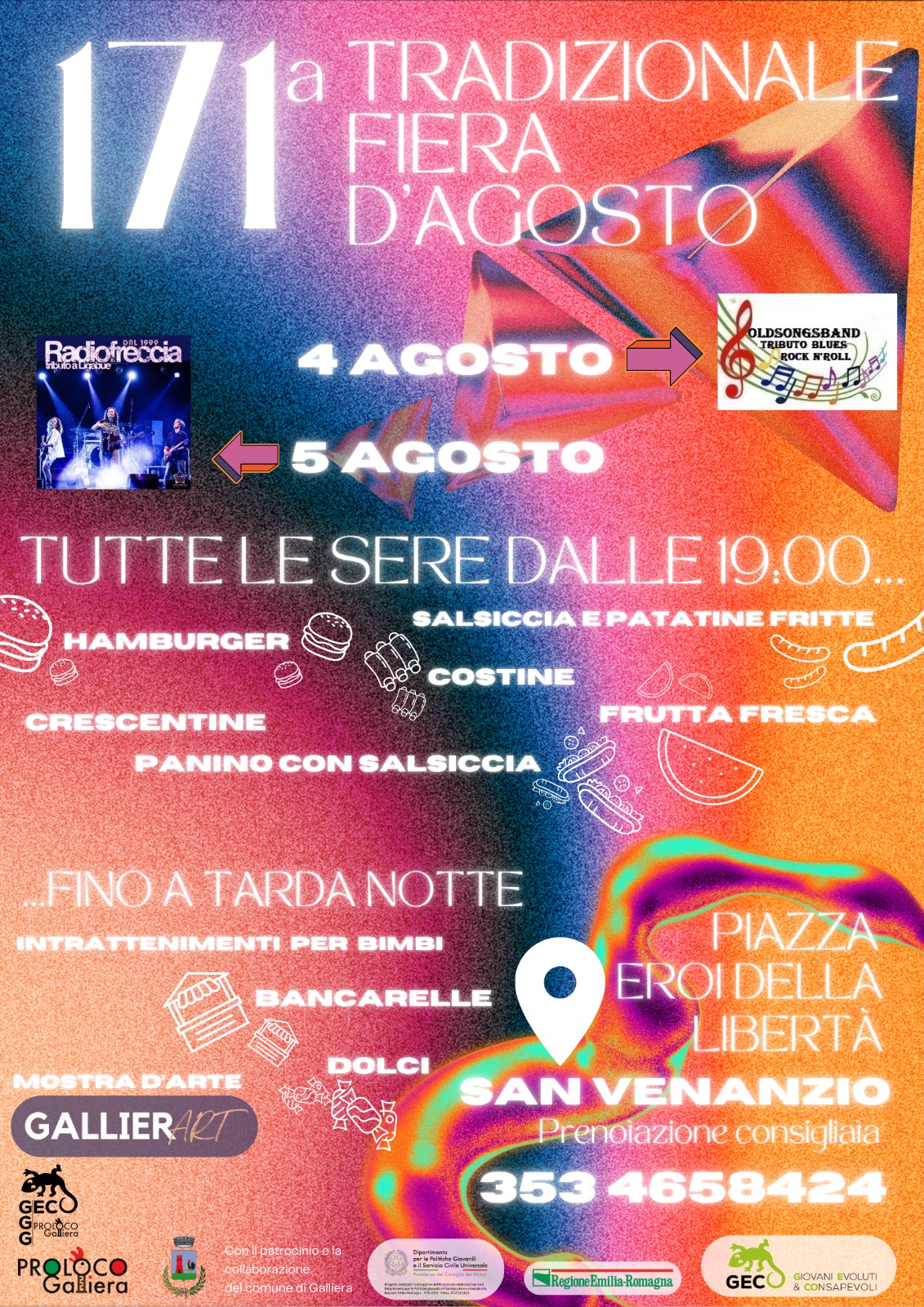 Pro Loco Galliera vi aspetta 4 e 5 agosto 2025 in piazza Eroi della Libertà a San Venanzio con due serate di musica dal vivo, stand gastronomico, bancarelle e attività per i più piccoli.