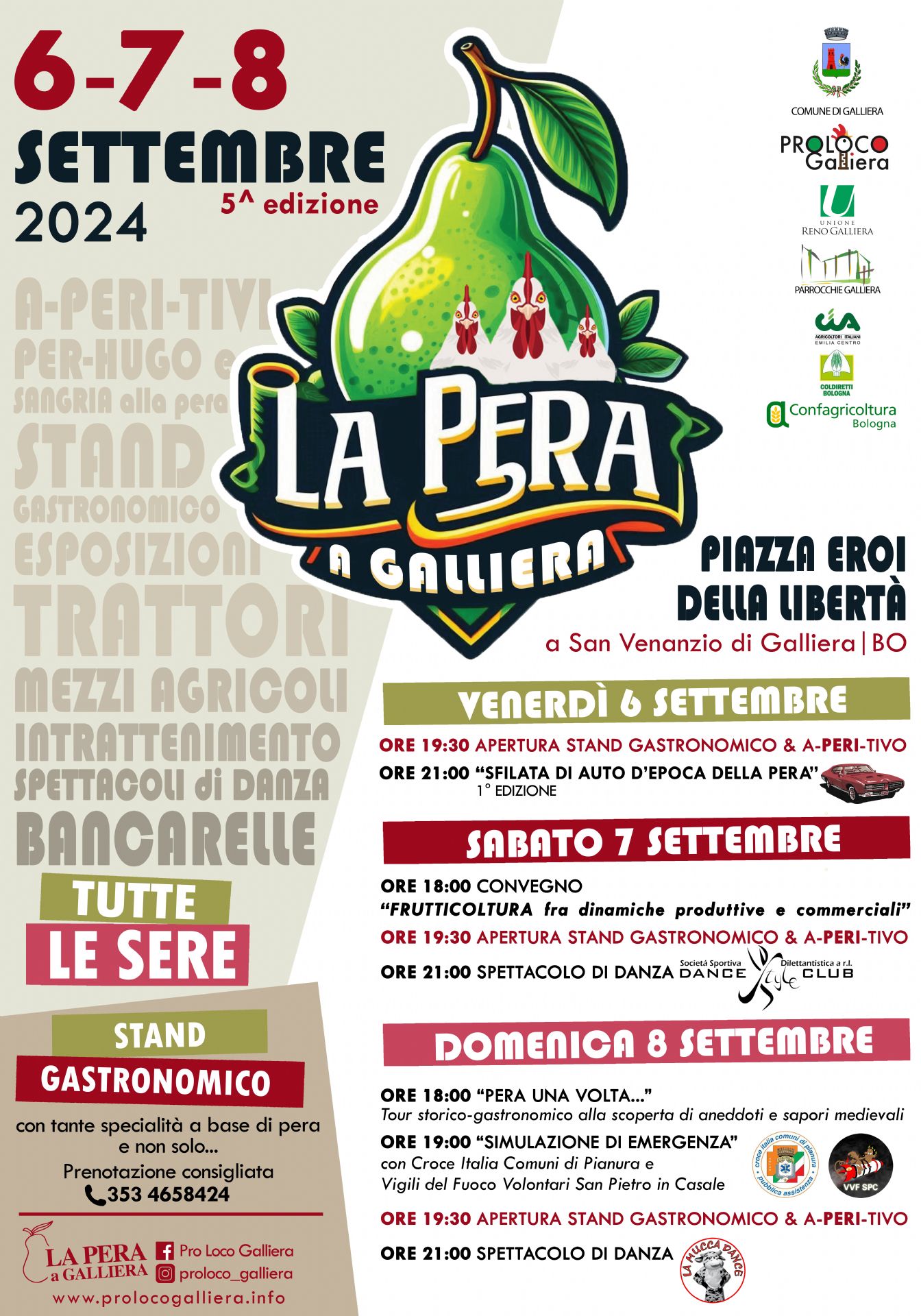 Pro Loco Galliera vi aspetta 6-7-8 settembre in Piazza Eroi della Libertà a San Venanzio con trattori e auto d’epoca, bancarelle e spettacoli per tutta la famiglia, uno stand gastronomico con tante specialità a base di pera e non solo…