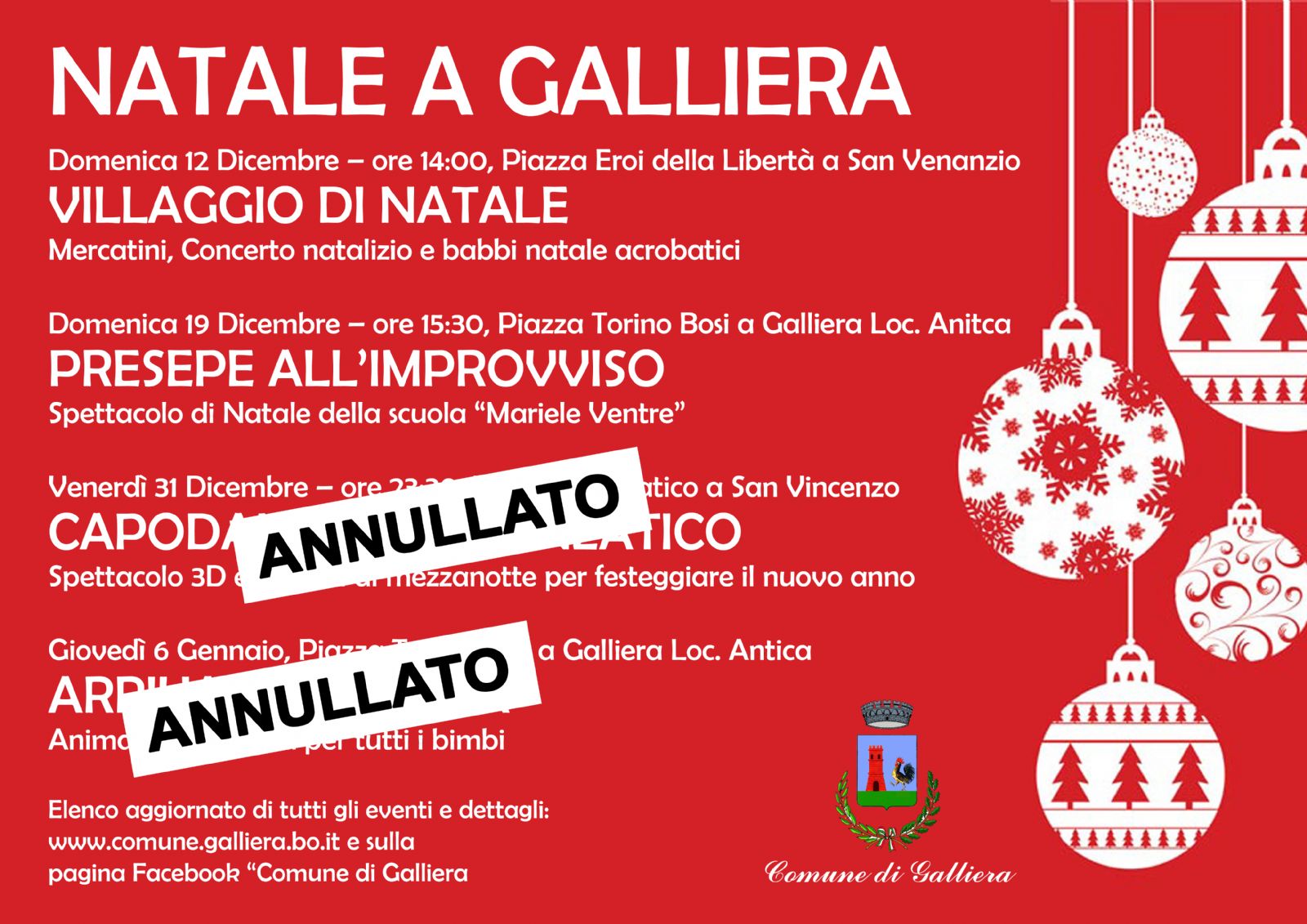 Purtroppo, viste le ultime disposizioni in materia di contenimento della pandemia, gli eventi in programma per il 31 Dicembre 2021 in Piazza Manzatico a San Vincenzo e il 6 Gennaio 2022 in Piazza T. Bosi a Galliera Antica sono ANNULLATI.