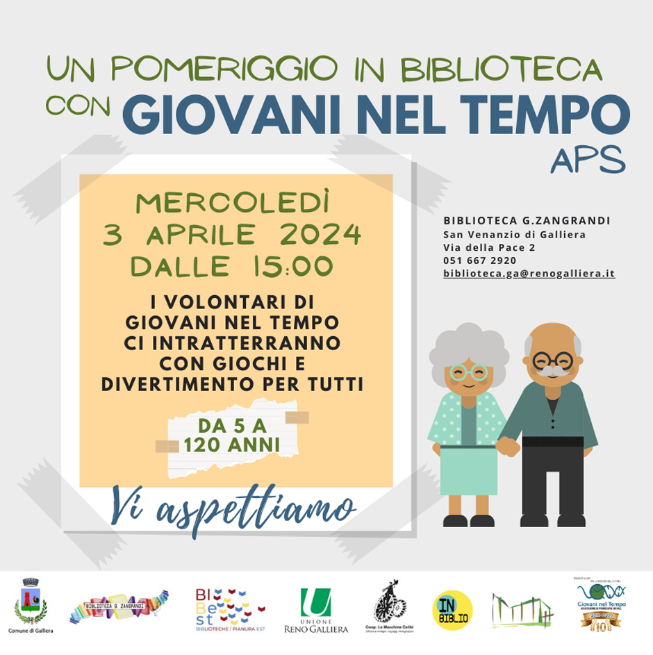 Mercoledì 3 aprile 2024 dalle ore 15:00 i volontari di GIOVANI NEL TEMPO ci intratterranno con giochi e divertimento per tutti.
