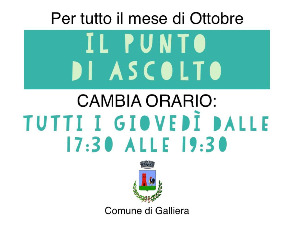 🖐 Si comunica che - in via sperimentale - per tutto il mese di OTTOBRE il Punto di Ascolto di Galliera località Antica cambierà orario e sarà aperto 𝗧𝗨𝗧𝗧𝗜 𝗶 𝗚𝗜𝗢𝗩𝗘𝗗𝗜', a partire dal 6 ottobre, 𝗱𝗮𝗹𝗹𝗲 𝗼𝗿𝗲 𝟭𝟳:𝟯𝟬 𝗮𝗹𝗹𝗲 𝗼𝗿𝗲 𝟭𝟵:𝟯𝟬, come di consueto presso il Centro Medico di Via Coronella 75/a.