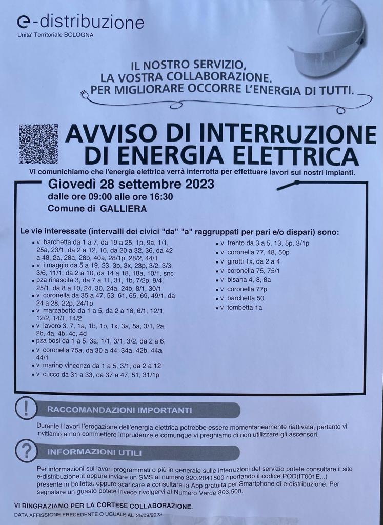 E-distribuzione ci comunica che, causa lavori alla rete elettrica, nella giornata di Giovedì 28.09.2023 dalle ore 09:00 alle ore 16:30 sarà interrotta l'energia elettrica a Galliera località Antica nelle seguenti vie: