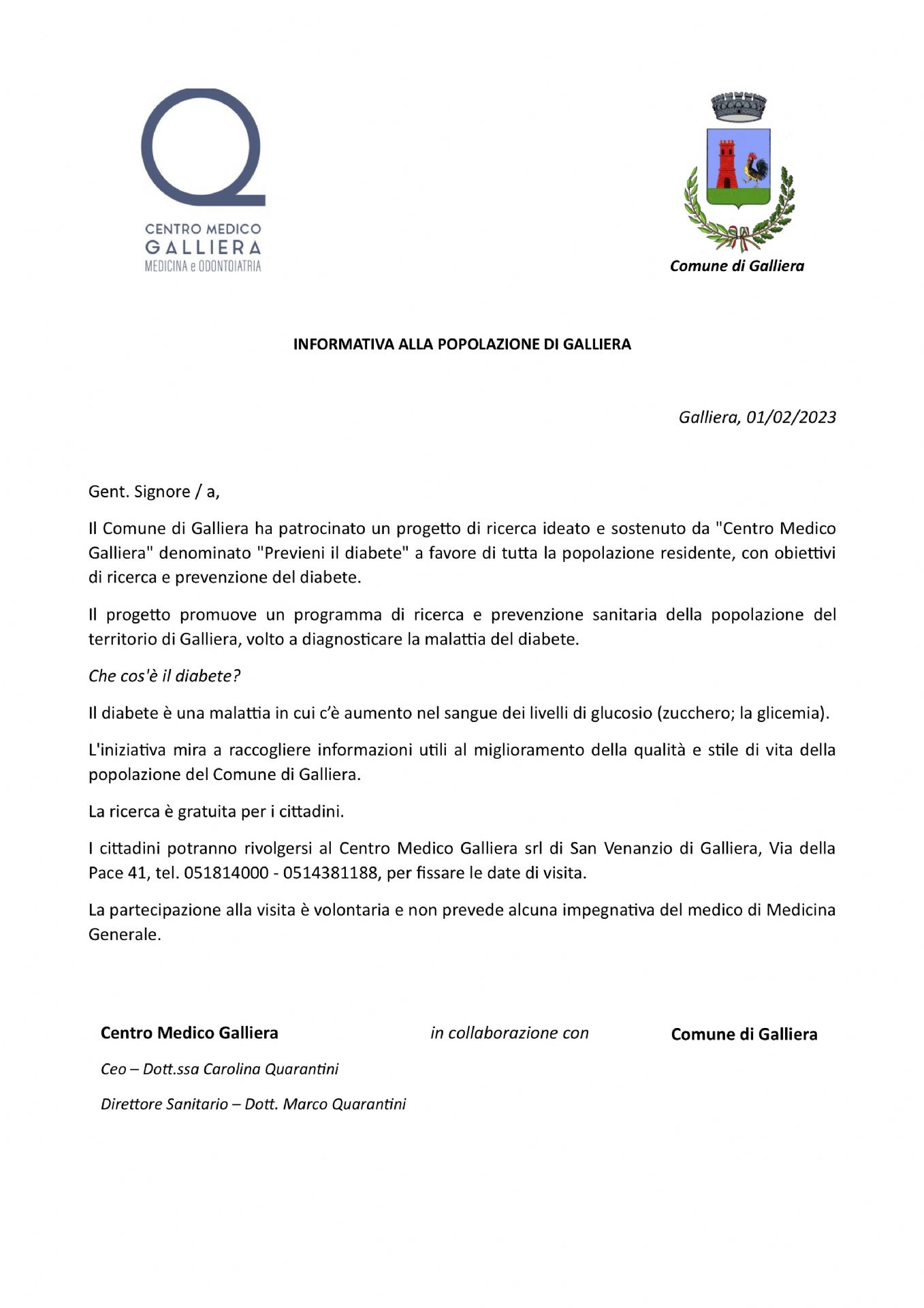 Il Comune di Galliera ha patrocinato un progetto di ricerca ideato e sostenuto da "Centro Medico Galliera" denominato "Previeni il diabete" a favore di tutta la popolazione residente, con obiettivi di ricerca e prevenzione del diabete.