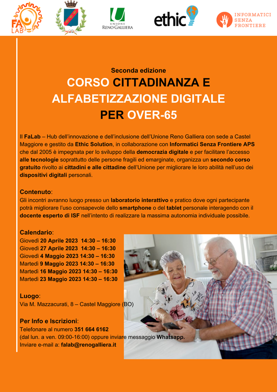 Il FaLab dell’Unione Reno Galliera è un hub dell'innovazione e dell'inclusione, ha sede a Castel Maggiore ed è gestito da Ethic Solution, che per questo progetto si è avvalso della collaborazione di Informatici senza Frontiere (ISF), ASP fondata da un gruppo di informatici mossi dalla volontà di facilitare, a tutti, l'accesso a strumenti tecnologici e dispositivi digitali oramai d'uso comune.