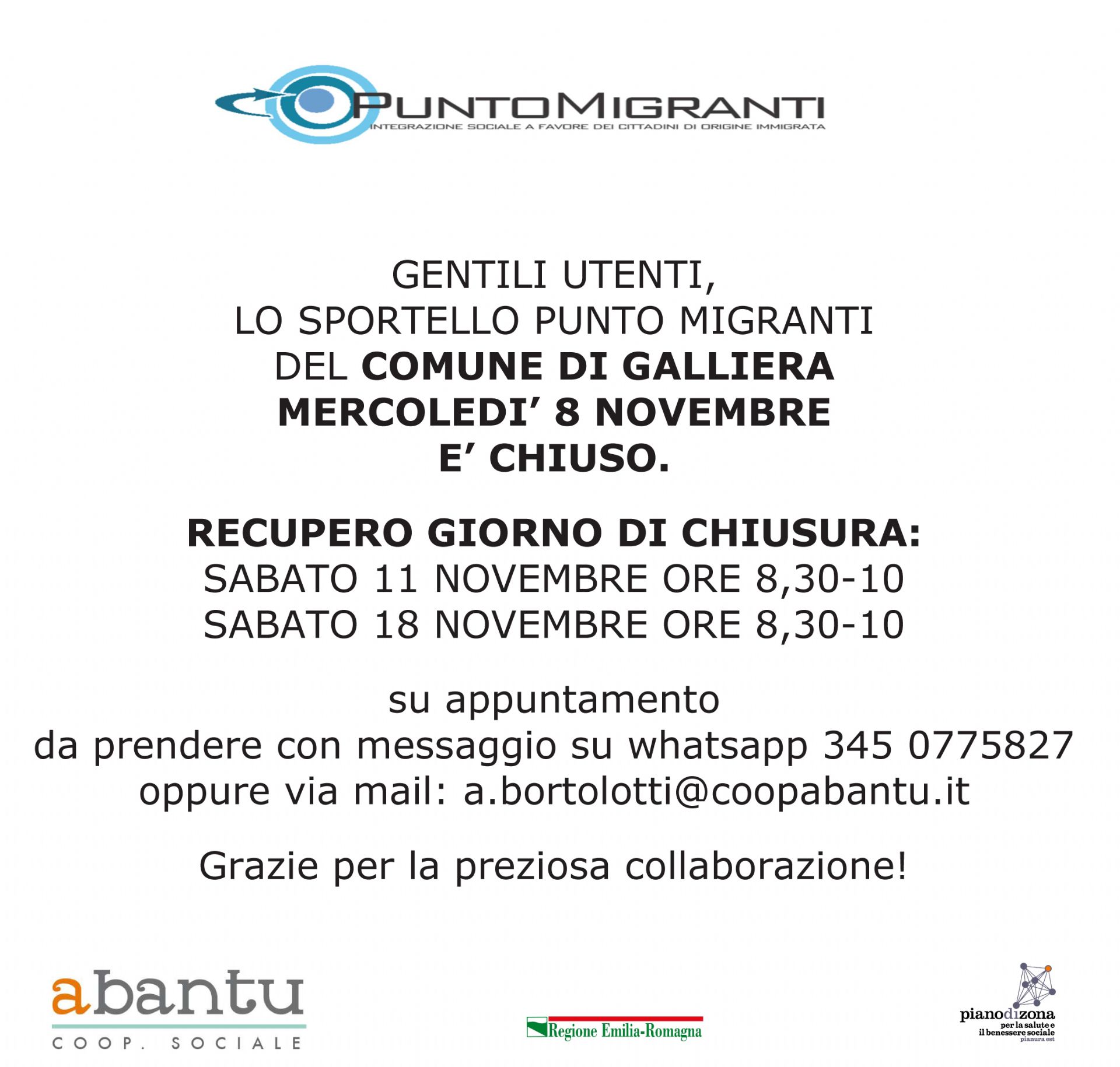 Si informa che nella mattinata di mercoledì 8 novembre lo Sportello Punto Migranti resterà chiuso al pubblico.
