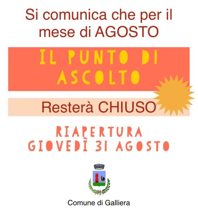 Si comunica che nel mese di agosto il PUNTO DI ASCOLTO a Galliera località Antica resterà chiuso.