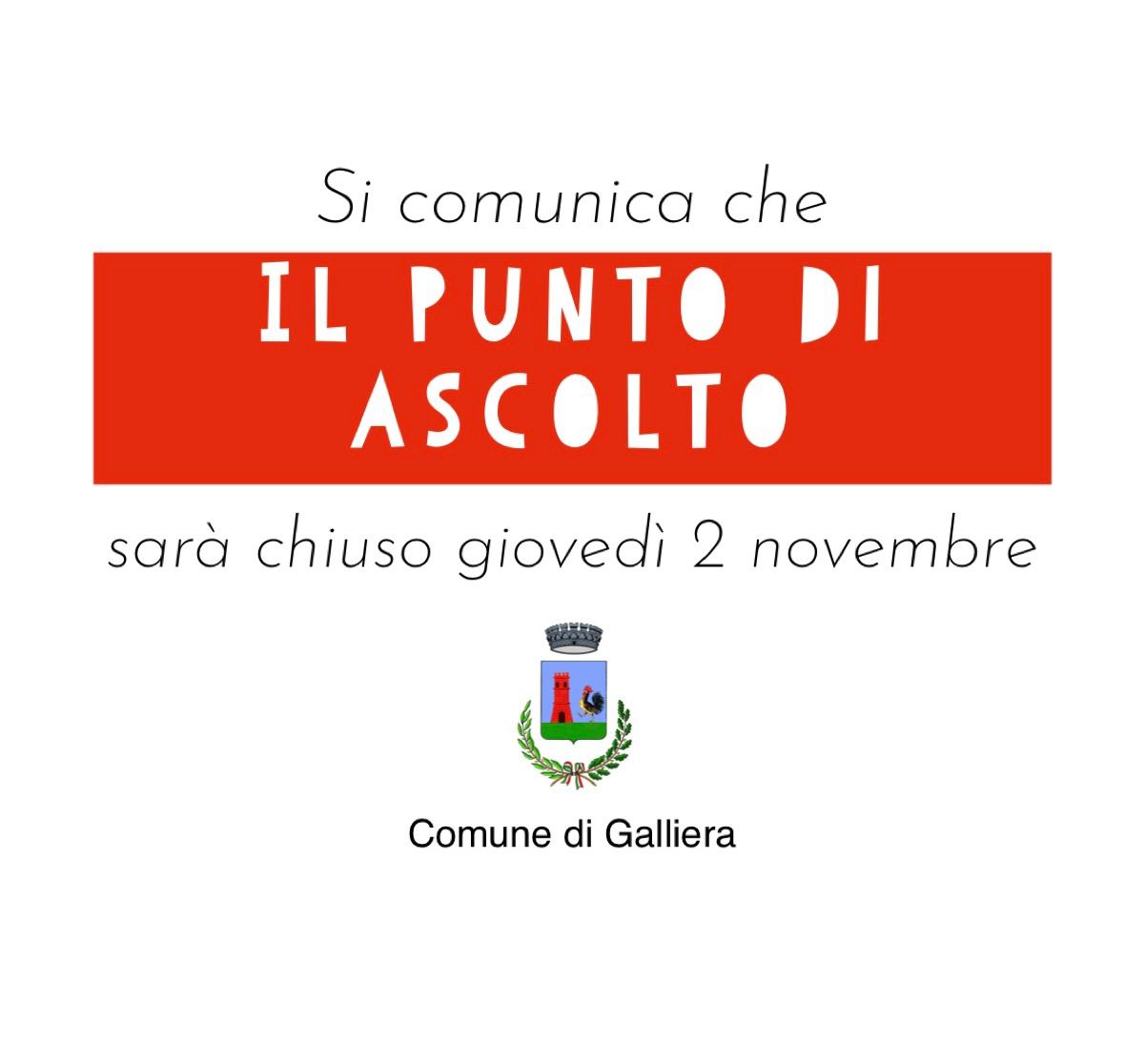 Si comunica che oggi giovedì 2 novembre il punto di ascolto a Galliera località Antica resterà chiuso.