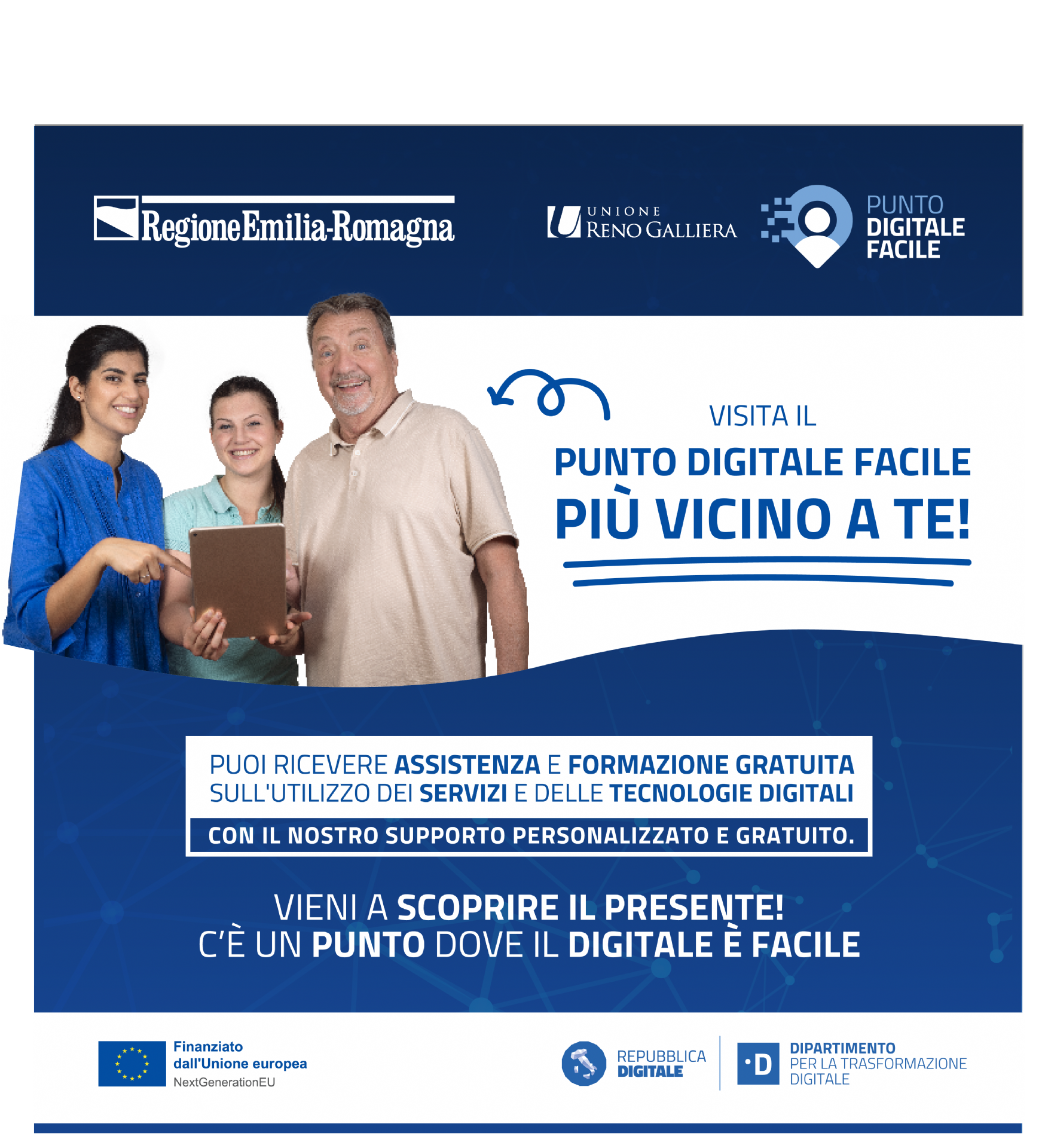 Scopri di più e prenota presso il Punto Digitale Facile più vicino a te, oppure vai sul sito dell'Unione Reno Galliera nella sezione specifica.