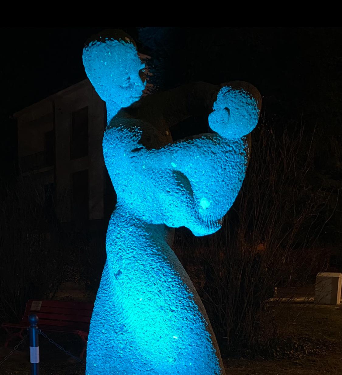 Oggi la scultura di Mazzacurati e la nostra Biblioteca comunale di Galliera si tingono di blu