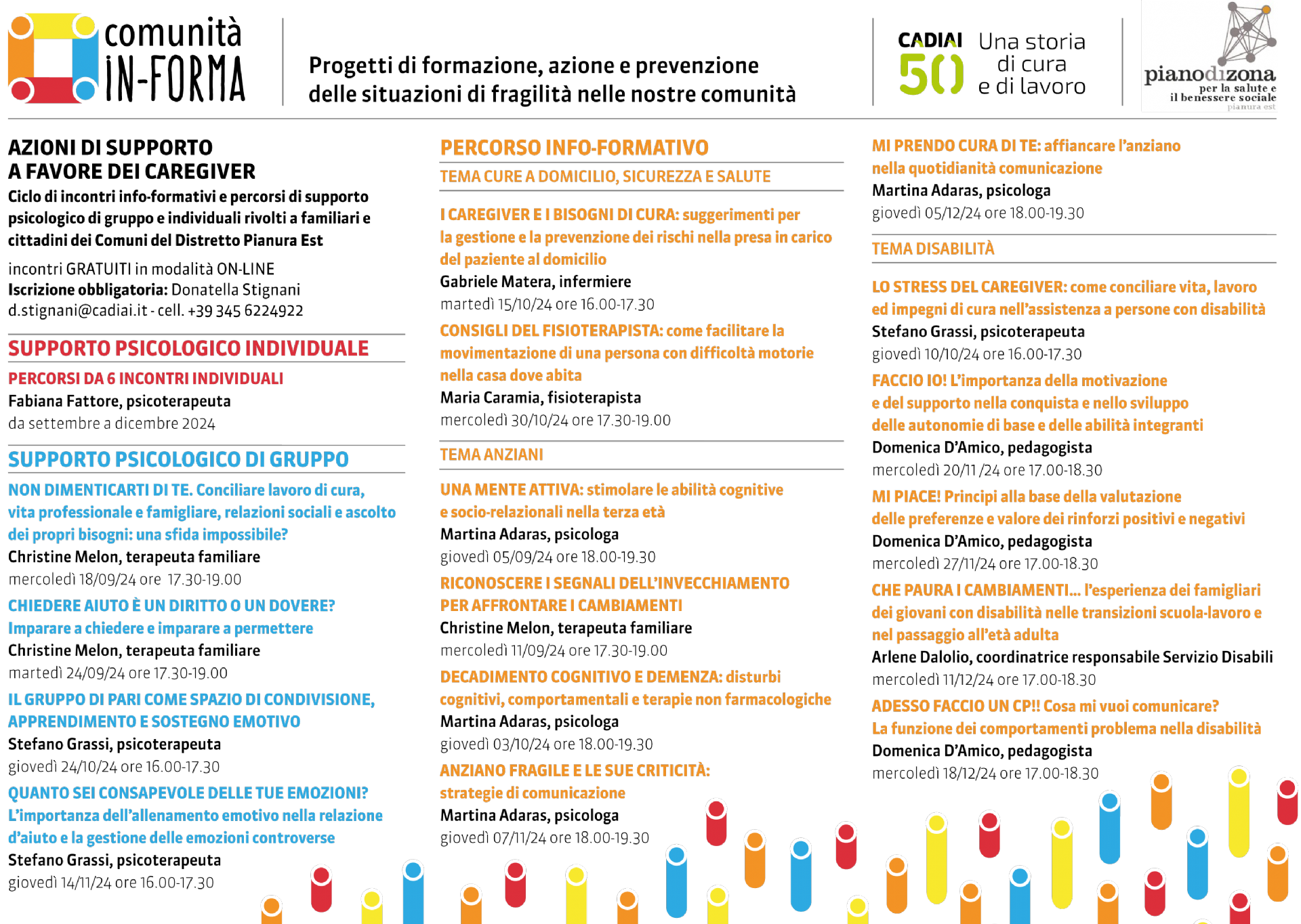 Comunità IN-Forma è un progetto distrettuale che vede coinvolti i quindici Comuni del Distretto Pianura Est, cittadini, volontari, operatori, caregiver, assistenti familiari, associazioni e tutti coloro che vorranno esserci per creare una rete rivolta alla prevenzione e al sostegno delle situazioni di fragilità che persone anziane o disabili possono vivere.