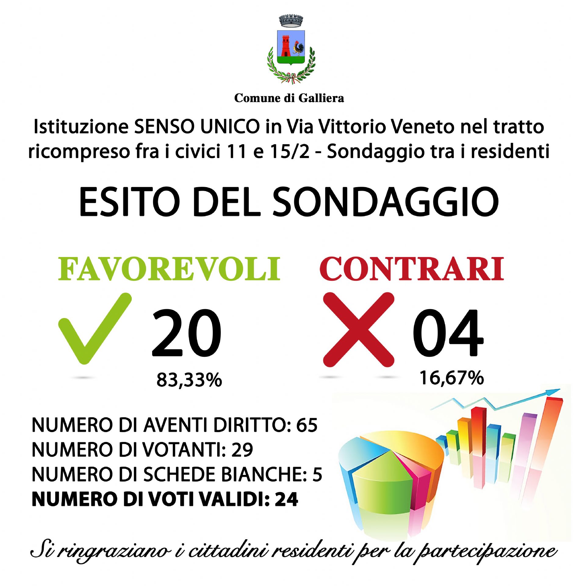 Qualche giorno fa è stato sottoposto ai residenti in Via Vittorio Veneto nel tratto ricompreso fra i civici 11 e 15/2 un sondaggio per conoscere la loro opinione in merito all’istituzione di SENSO UNICO con ingresso OBBLIGATO nel tratto prospicente Via Vittorio Veneto 11 e con uscita OBBLIGATA nel tratto prospicente Via Vittorio Veneto 15/2 fornendo così una maggior visibilità durante l'immissione sulla strada principale e consentendone un accesso più sicuro.