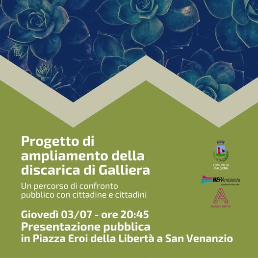 Giovedì o3 luglio 2025 alle ore 20:45 in Piazza Eroi della Libertà a San Venanzio si terrà la Presentazione pubblica del progetto di ampliamento della discarica di Galliera e l’avvio del percorso di confronto pubblico.