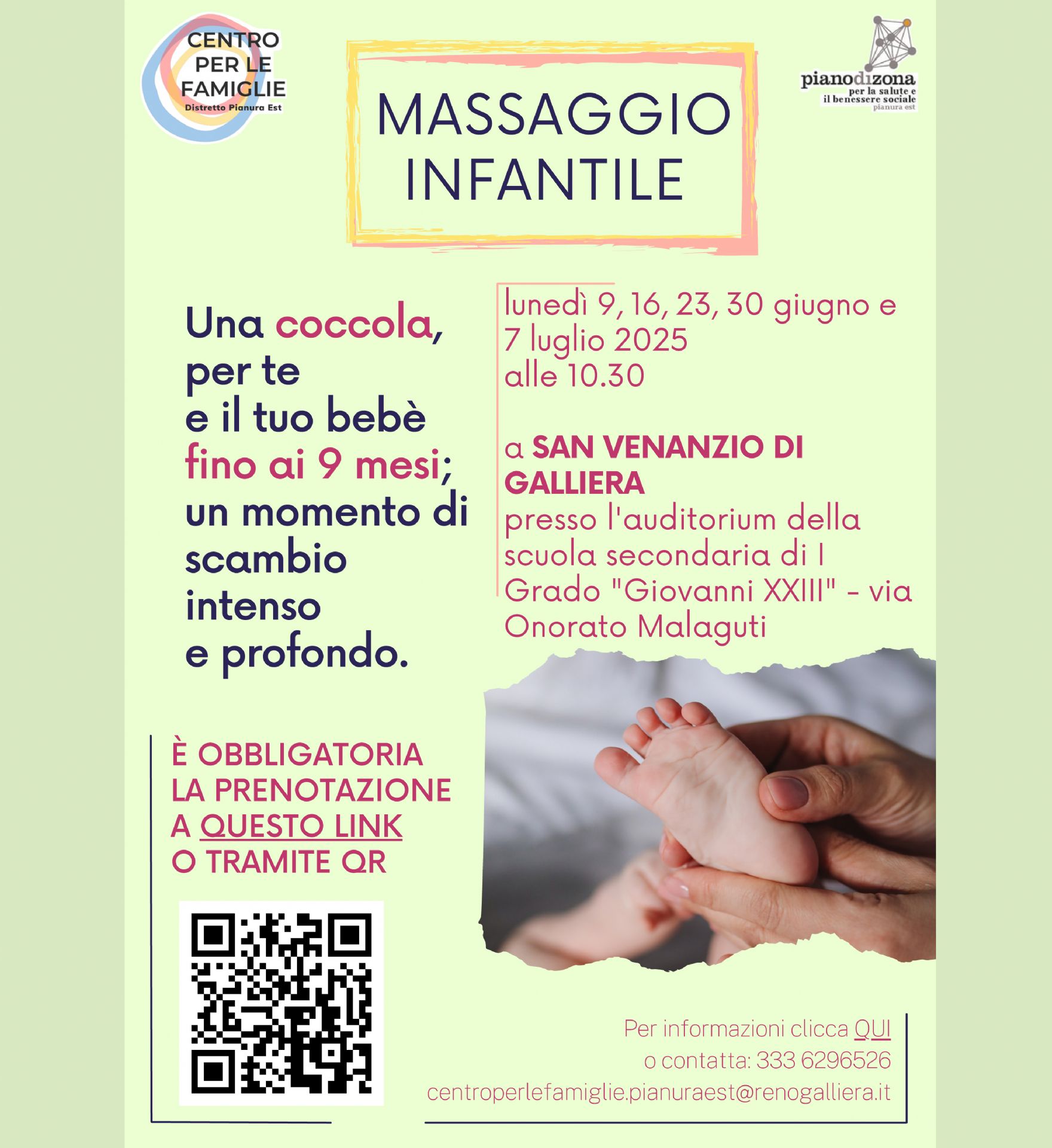 Un percorso di 5 incontri, gratuito, proposto dal Centro per le Famiglie Distretto Pianura Est e condotto da una operatrice dell'AIMI - Associazione Italiana Massaggio Infantile.