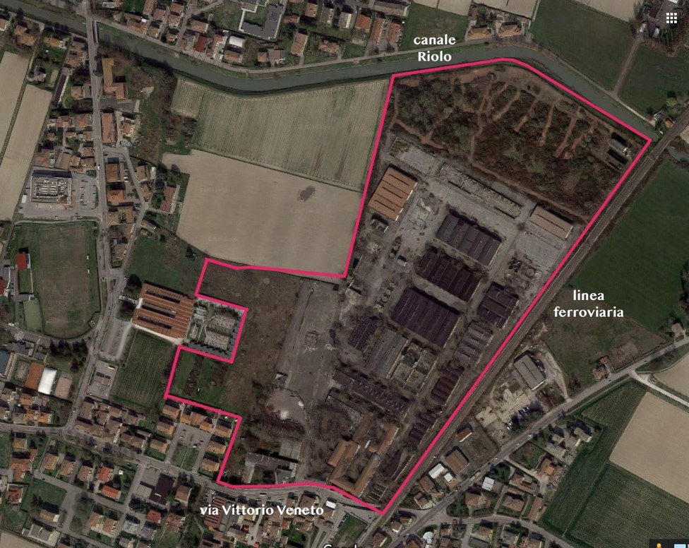 L’area è delimitata a sud dalla via Vittorio Veneto, ove è ubicato l’unico accesso all’area, ad est dai binari ferroviari della linea Bologna – Venezia paralleli alla strada SP4, a nord dal Canale Riolo e ad ovest da alcuni terreni che la separano dal nucleo abitato.