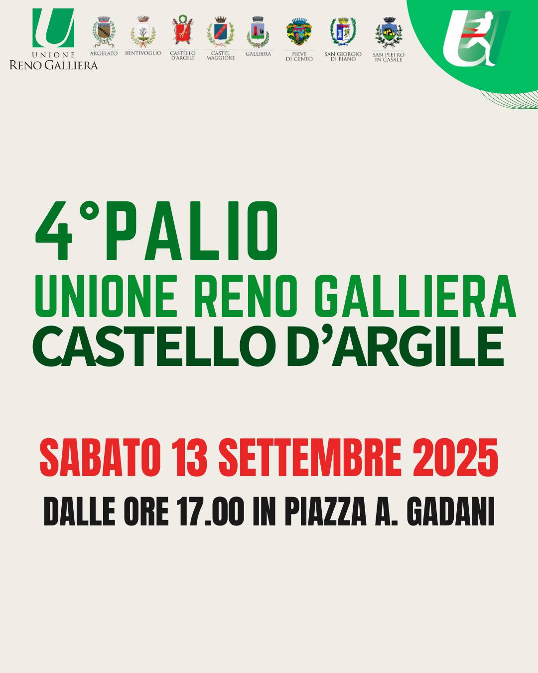 Il Comune di CASTELLO D'ARGILE ospiterà la quarta edizione del palio in cui gli otto Comuni dell'Unione Reno Galliera si sfideranno in una avvincente gara a staffetta.