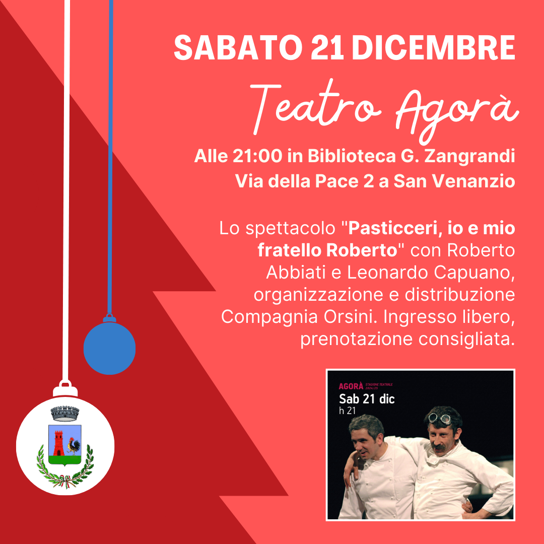 Lo spettacolo "Pasticceri, io e mio fratello Roberto" con Roberto Abbiati e Leonardo Capuano, organizzazione e distribuzione Compagnia Orsini. Ingresso libero, prenotazione consigliata su biglietteria.teatri@renogalliera.it | tel. 333 8839450