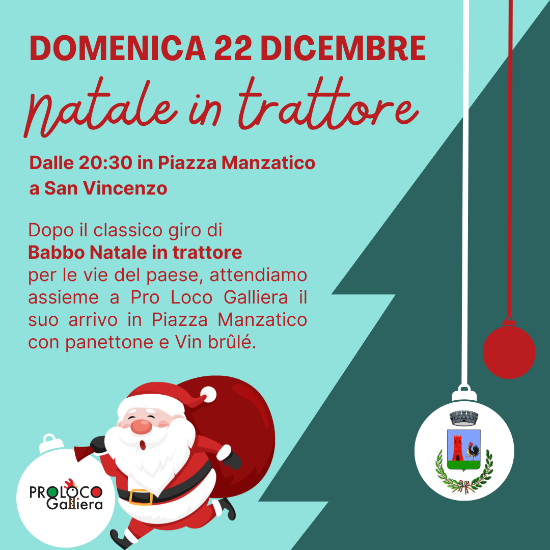 Dopo il classico giro di Babbo Natale in trattore per le vie del paese, attendiamo assieme a Pro Loco Galliera il suo arrivo in Piazza Manzatico con panettone e Vin brûlé.