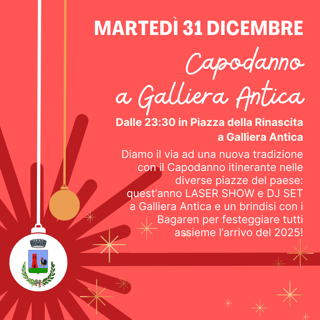 Diamo il via ad una nuova tradizione con il Capodanno itinerante nelle diverse piazze del paese: quest’anno LASER SHOW e DJ SET a Galliera Antica e un brindisi con i Bagaren per festeggiare tutti assieme l’arrivo del 2025!