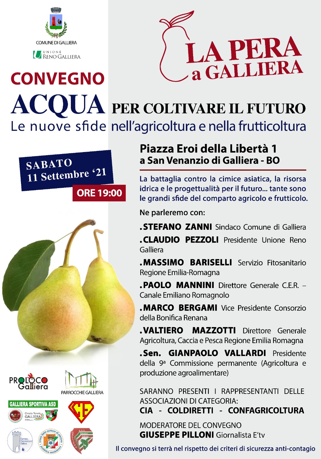 Il convegno si svolgerà all'interno dell'iniziativa “LA PERA A GALLIERA”, organizzata dal Comune di Galliera in collaborazione con le Associazioni di volontariato locali di concerto con le Associazioni di categoria del comparto agricolo, che si terrà sempre in Piazza Eroi della Libertà a San Venanzio di Galliera nei giorni 10 e 11 Settembre p.v..