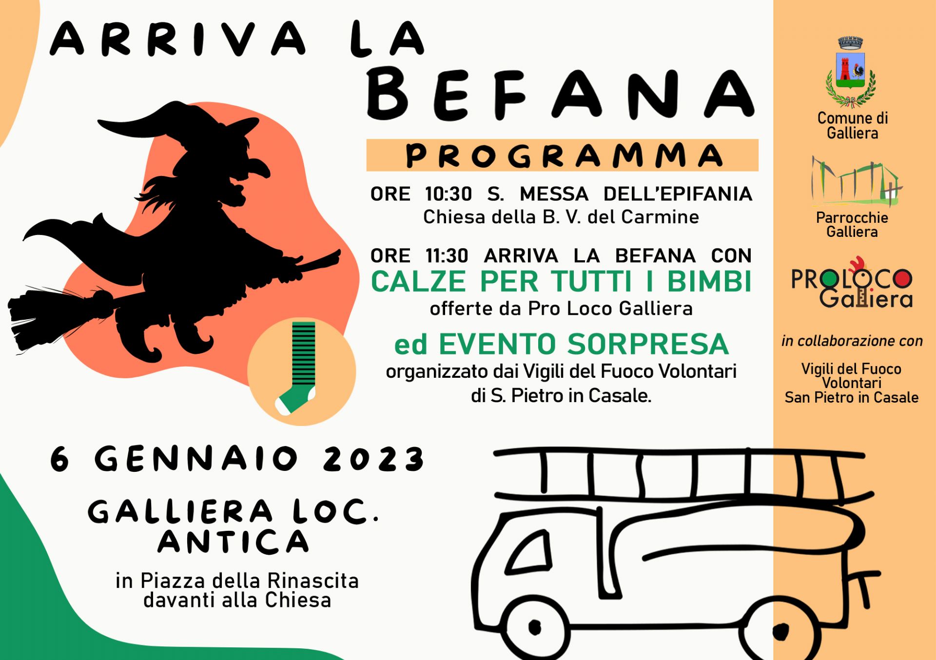- ore 11:30 ARRIVA LA BEFANA con CALZE PER TUTTI I BIMBI offerte da Pro Loco Galliera e… EVENTO SORPRESA organizzato dai Vigili del Fuoco Volontari San Pietro in Casale.