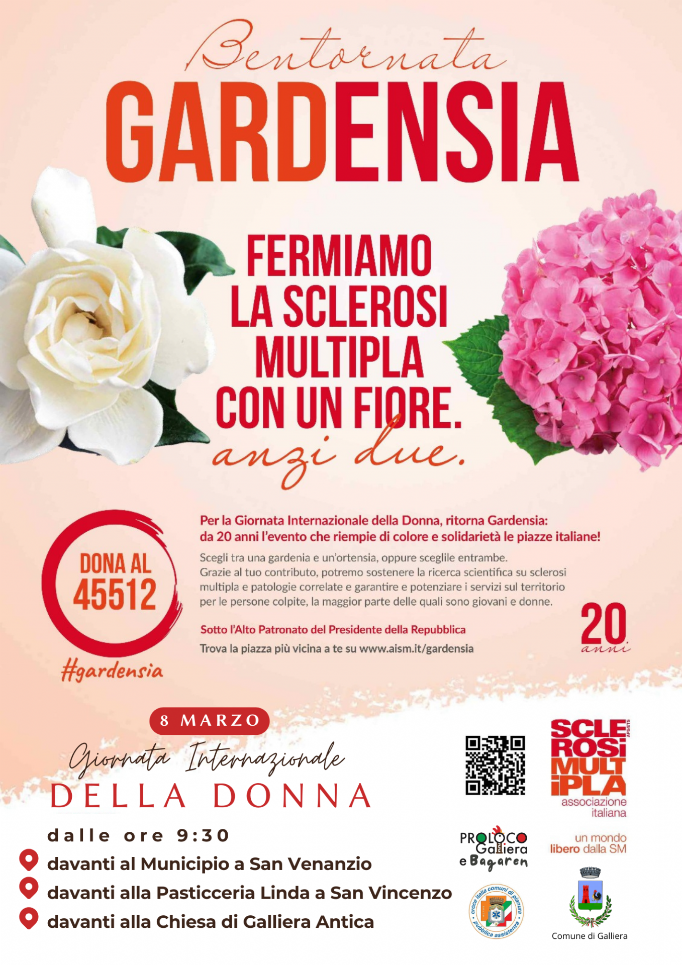 Sabato 8 marzo dalle 9:30 troverete volontarie e volontari di Proloco, Bagaren e Croce Italia Comuni di Pianura con gardenie e ortensie per la ricerca di AISM - Associazione Italiana Sclerosi Multipla: