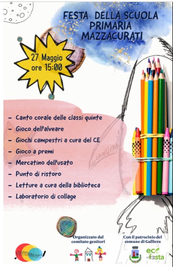 SABATO 27 MAGGIO DALLE ORE 15:00 IL COMITATO GENITORI MAZZACURATI CON IL PATROCINIO DEL COMUNE DI GALLIERA ORGANIZZA LA "FESTA DELLA SCUOLA PRIMARIA MAZZACURATI".