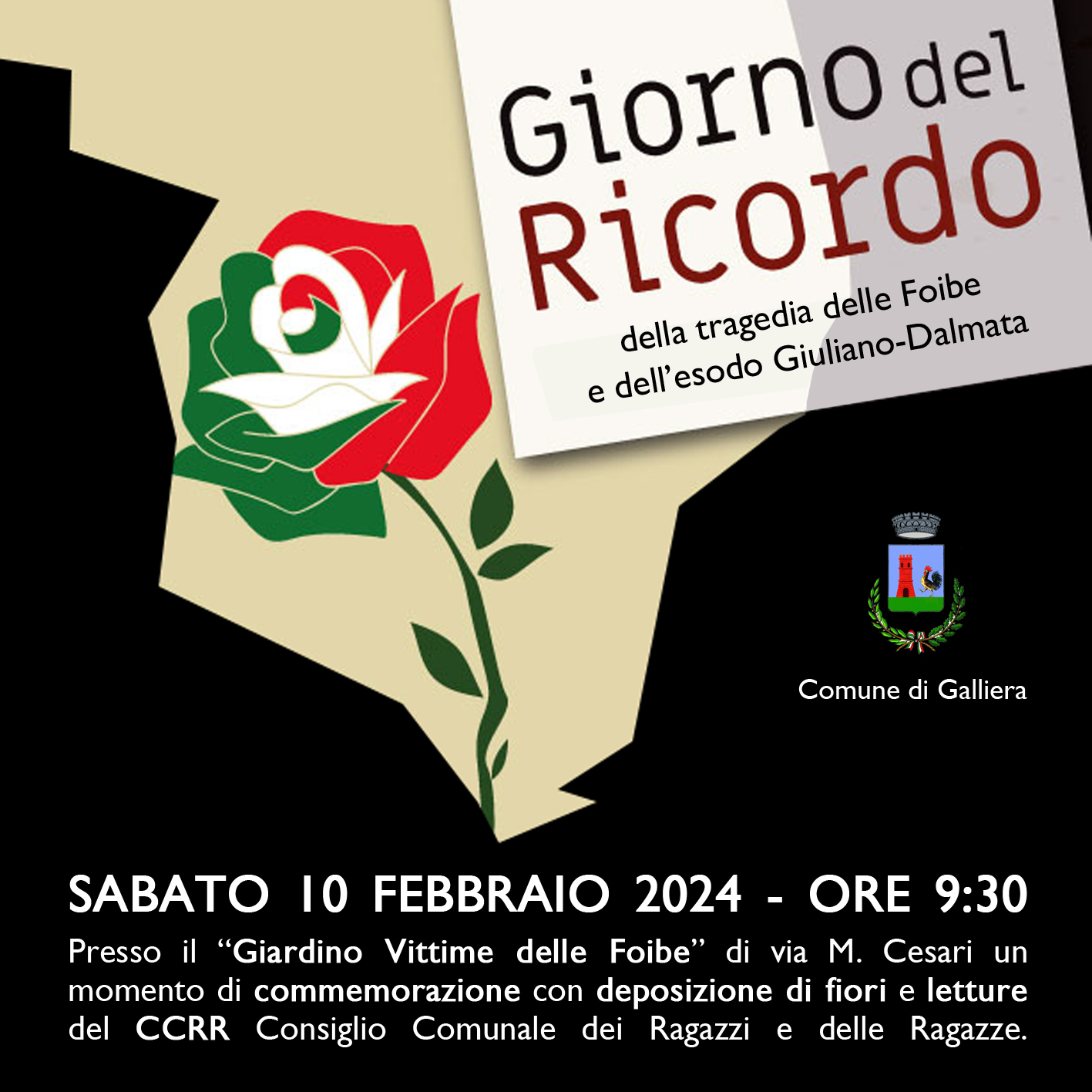 Sabato 10 febbraio 2024 alle ore 9:30 presso il “Giardino Vittime delle Foibe” di via M. Cesari un momento di commemorazione con deposizione di fiori e letture del Consiglio Comunale dei Ragazzi e delle Ragazze.