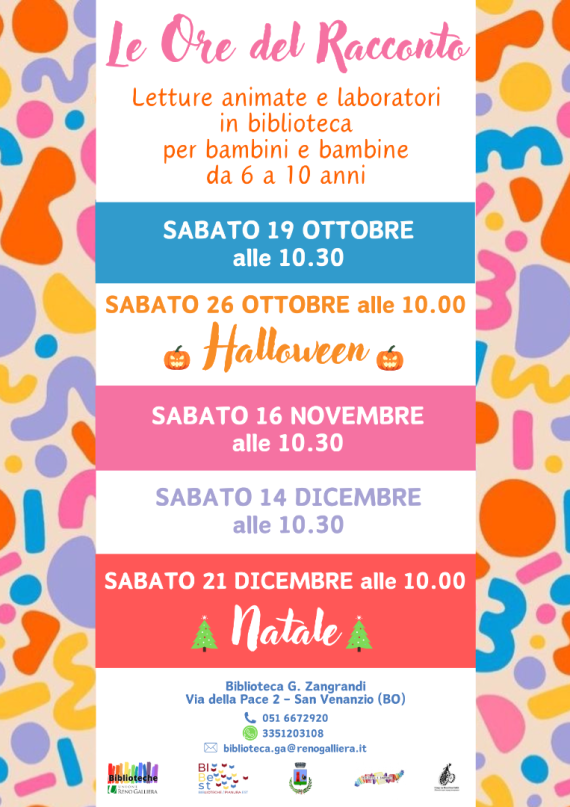 Gli incontri si tengono al sabato mattina dalle ore 10:30 in Biblioteca G. Zangrandi - Via della Pace 2, San Venanzio di Galliera