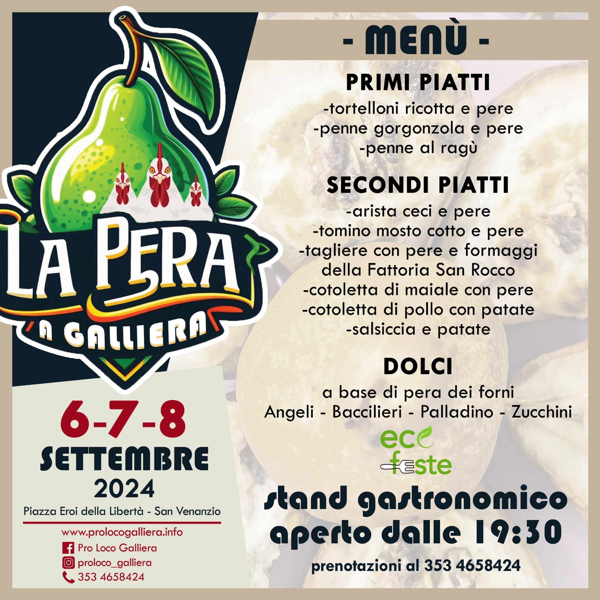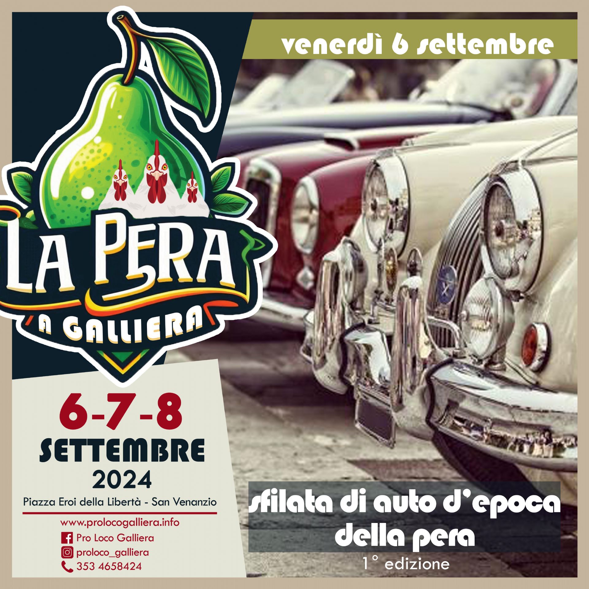 Pro Loco Galliera vi aspetta 6-7-8 settembre in Piazza Eroi della Libertà a San Venanzio con trattori e auto d’epoca, bancarelle e spettacoli per tutta la famiglia, uno stand gastronomico con tante specialità a base di pera e non solo…