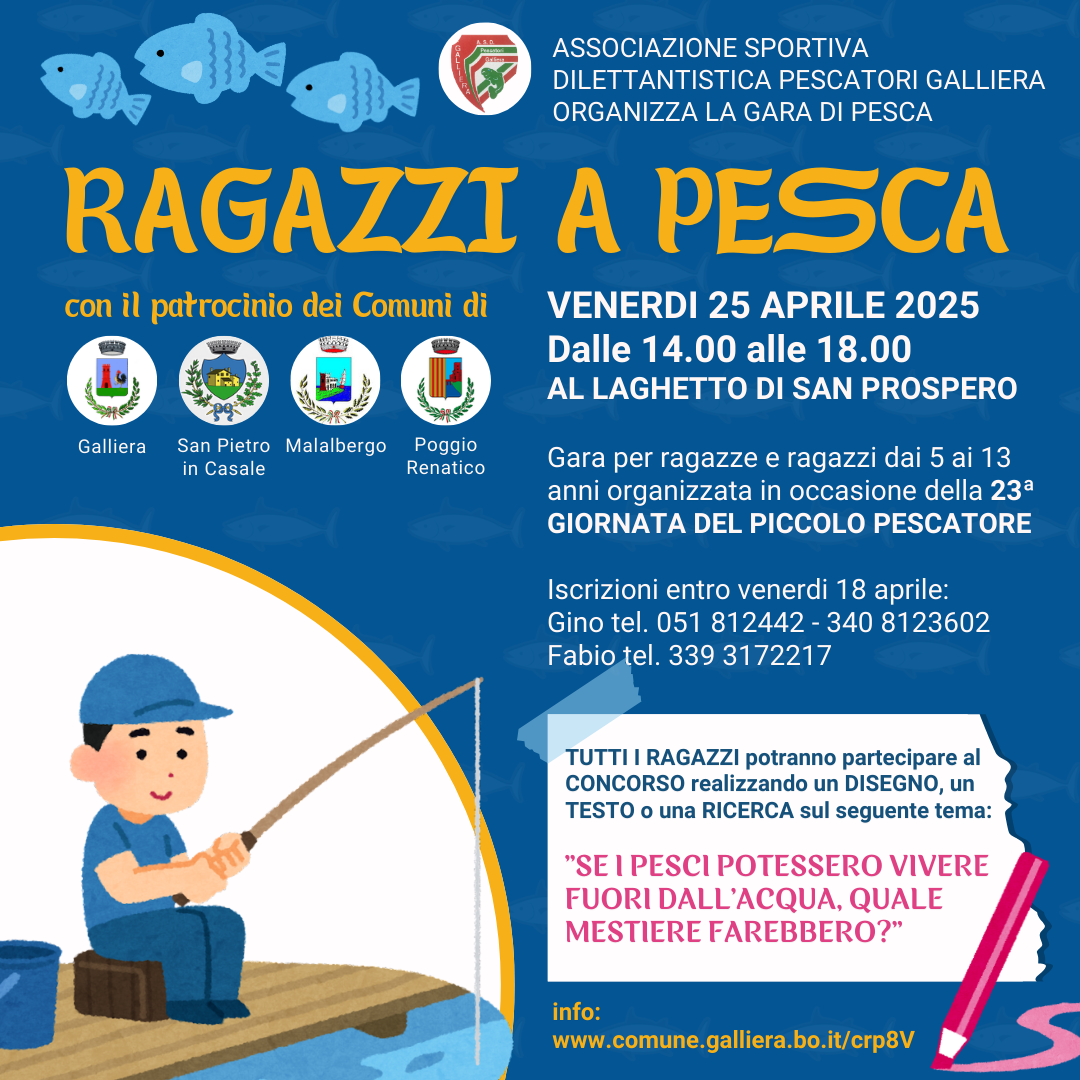 L'ASSOCIAZIONE SPORTIVA DILETTANTISTICA PESCATORI GALLIERA organizza LA GARA DI PESCA per ragazze e ragazzi dai 5 ai 13 anni in occasione della 23ª GIORNATA DEL PICCOLO PESCATORE che si svolgerà VENERDI 25 APRILE 2025 dalle 14.00 alle 18.00 al LAGHETTO DI SAN PROSPERO.