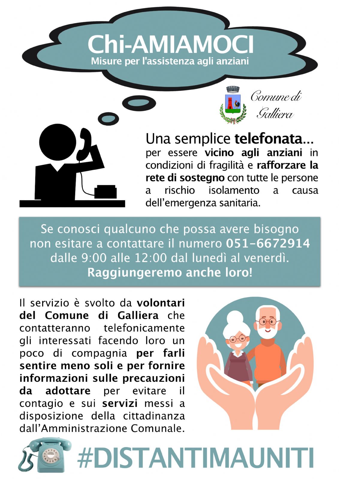 Grazie alla rete di volontariato della comunità di Galliera, le persone a rischio isolamento e i più anziani, saranno raggiunti da una telefonata; gli operatori non solo si accerteranno delle loro condizioni di salute, ma faranno in modo che non si sentano abbandonati; sarà inoltre l’occasione per fornire loro informazioni sulle precauzioni da adottare per evitare il contagio e sui servizi messi a disposizione della cittadinanza dall'Amministrazione Comunale.
