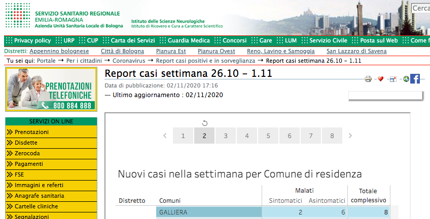 Pubblichiamo il report dell'Azienda USL di Bologna che fotografa la situazione riferita alla settimana precedente (dal 26 Ottobre al 1 Novembre).