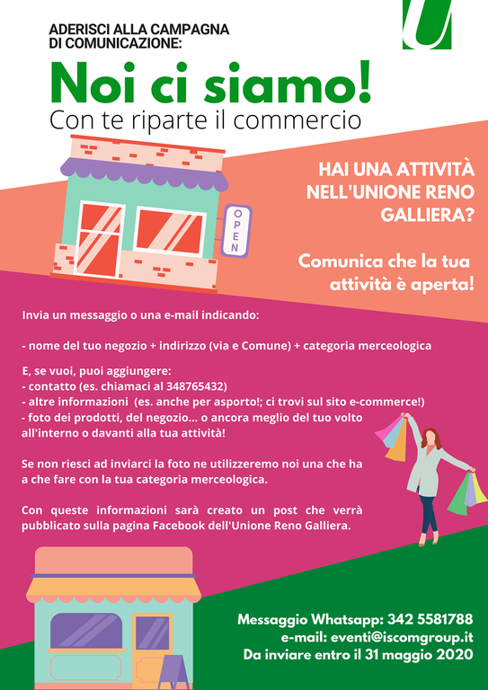 Noi ci siamo! con te riparte il commercio è lo slogan della campagna di comunicazione che accompagnerà i negozi, bar, ristoranti, parrucchieri, estetisti del territorio dell’Unione Reno Galliera nella fase di ripartenza dopo il blocco forzato di gran parte delle attività per l’emergenza sanitaria.