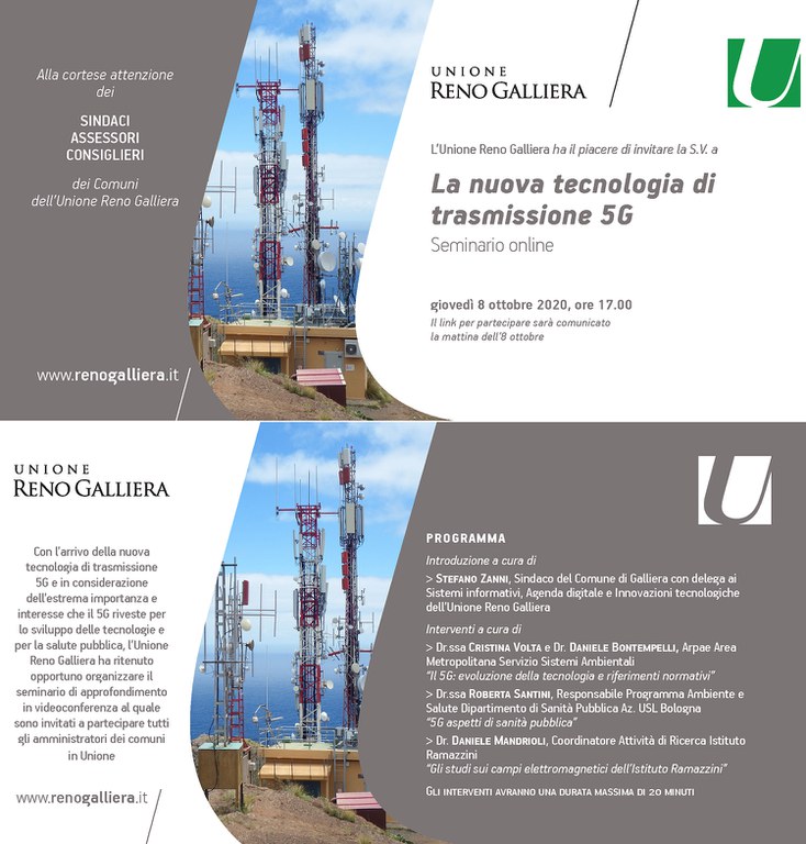 Sono disponibili gli atti del seminario di approfondimento sulla nuova tecnologia di trasmissione 5G tenutosi in videoconferenza, giovedì 8 ottobre 2020, al quale sono stati invitati a partecipare tutti gli amministratori degli comuni in Unione Reno Galliera (Argelato, Bentivoglio, Castello d'Argile, Castel Maggiore, Galliera, Pieve di Cento, San Giorgio di Piano e San Pietro in Casale).
