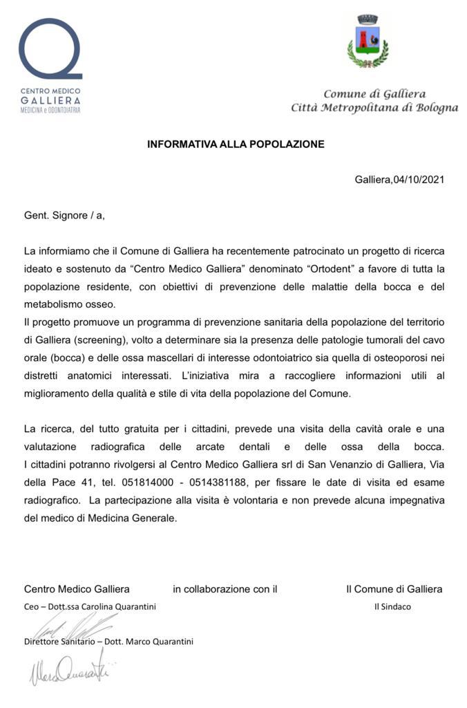 Il Comune di Galliera ha patrocinato un progetto di ricerca ideato e sostenuto da "Centro Medico Galliera" denominato "Ortodent" a favore di tutta la popolazione residente, con obiettivi di prevenzione delle malattie della bozza e del metabolismo osseo.