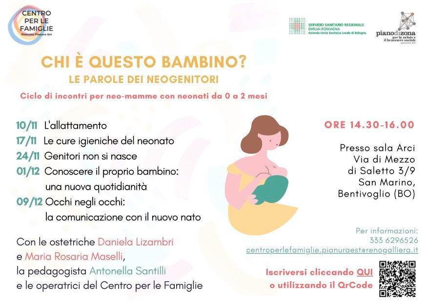 Il Centro per le famiglie del Distretto Pianura Est organizza un ciclo di incontri rivolto ai neo-genitori con neonati dai 0 ai 2 mesi. Uno spazio per informarsi, incontrarsi e confrontarsi, in collaborazione con le ostetriche Daniela Lizambri e Maria Rosaria Maselli, la pedagogista Antonella Santilli e le operatrici del Centro per le famiglie.