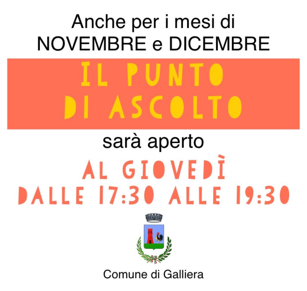 Anche per i mesi di Novembre e Dicembre il Punto di Ascolto a Galliera Loc. Antica prosegue con il Giovedì pomeriggio dalle 17:30 alle 19:30.