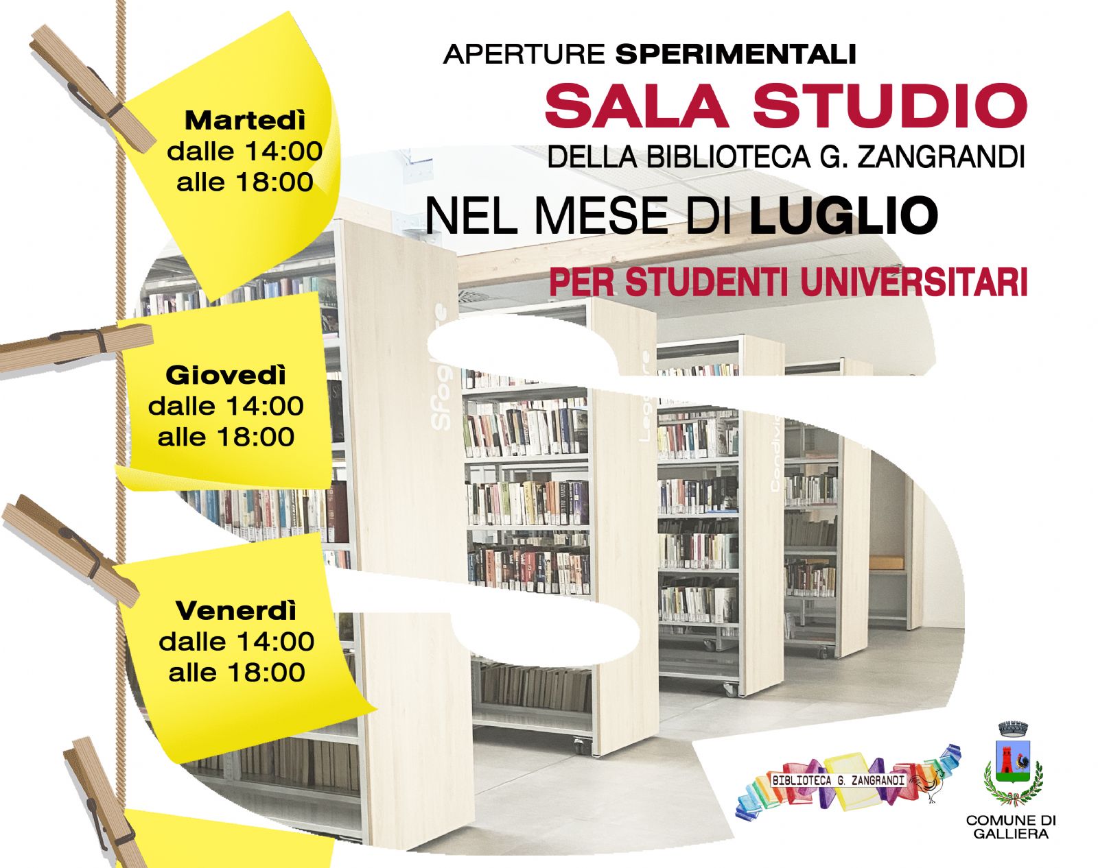 Fino a Venerdì 29 Luglio la SALA STUDIO della Biblioteca comunale di Galliera resterà aperta in via sperimentale nei seguenti pomeriggi: