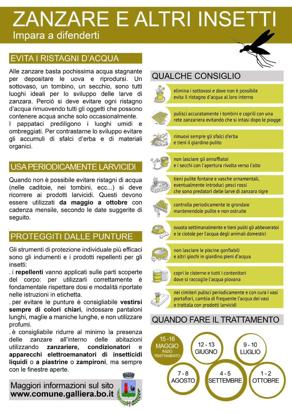 Come negli anni passati il programma di lotta alle zanzare prevede, già nei mesi primaverili, lo svolgimento di trattamenti larvicidi nelle caditoie stradali e lungo i canali (entrambi effettuati dal Comune) e dei tombini siti nelle aree private (effettuati dai cittadini). I trattamenti adulticidi invece sono previsti solo in casi eccezionali, su indicazione dell'AUSL per evitare fenomeni di resistenza negli insetti.