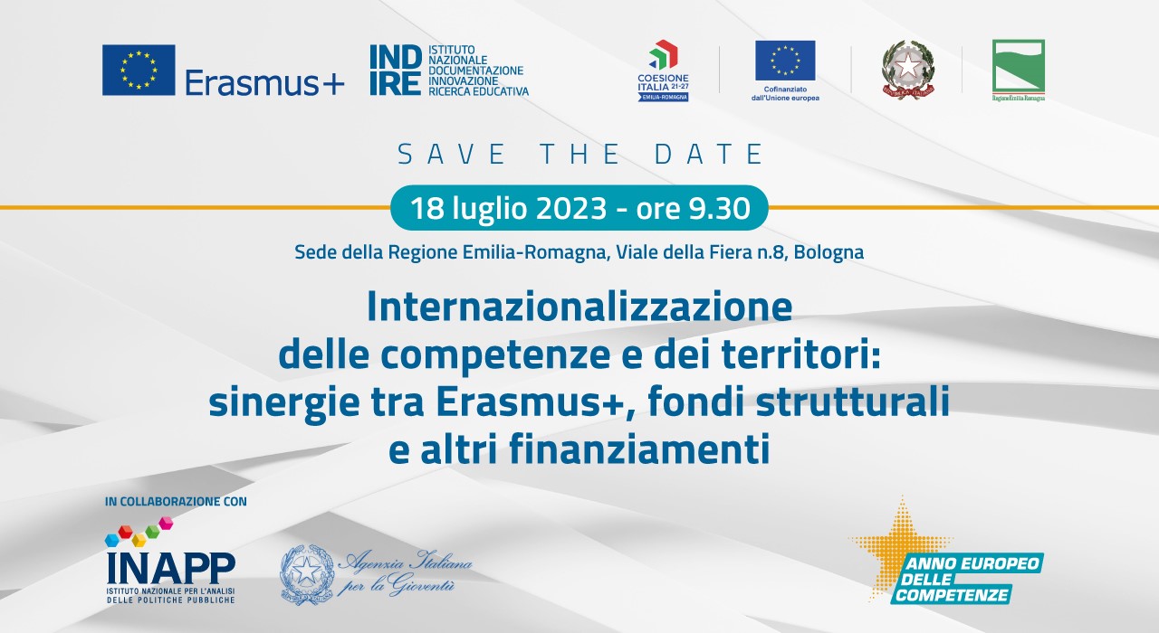 La Regione Emilia-Romagna e l'Agenzia nazionale Erasmus+ INDIRE, in collaborazione con le Agenzie nazionali Erasmus+ INAPP e AIG, sono liete di invitarla alla conferenza Internazionalizzazione delle competenze e dei territori: sinergie tra Erasmus+, fondi strutturali e altri finanziamenti, in programma il 18 luglio 2023, ore 9,30 a Bologna, presso la sede della Regione, Viale della Fiera n. 8.