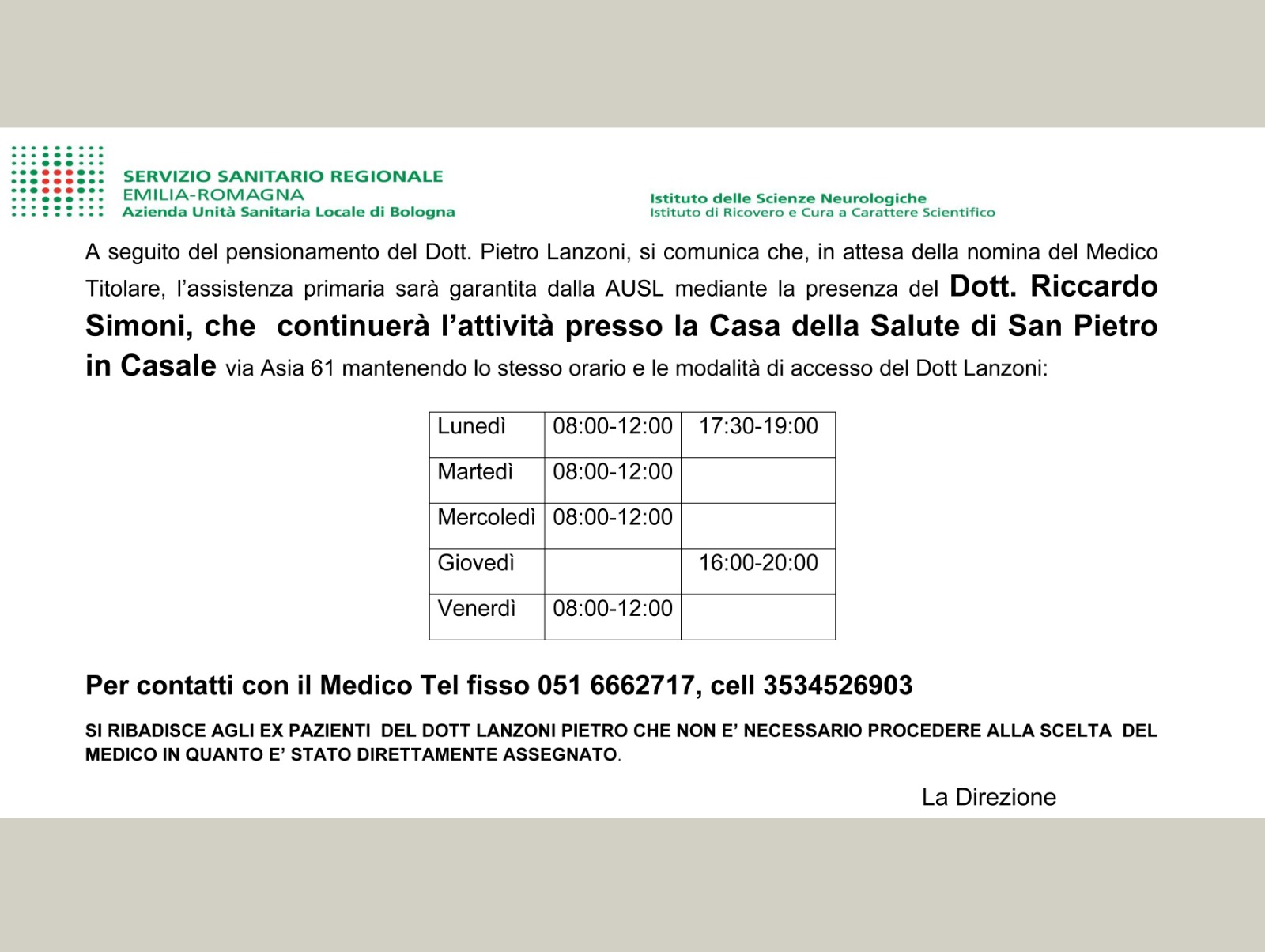 Riceviamo e condividiamo la comunicazione di AUSL Bologna: a seguito del pensionamento del Dott. Pietro Lanzoni, in attesa della nomina del Medico Titolare, l’assistenza primaria sarà garantita dalla AUSL mediante la presenza del Dott. Riccardo Simoni, che continuerà l’attività presso la Casa della Salute di San Pietro in Casale via Asia 61 mantenendo lo stesso orario e le modalità di accesso del Dott Lanzoni.