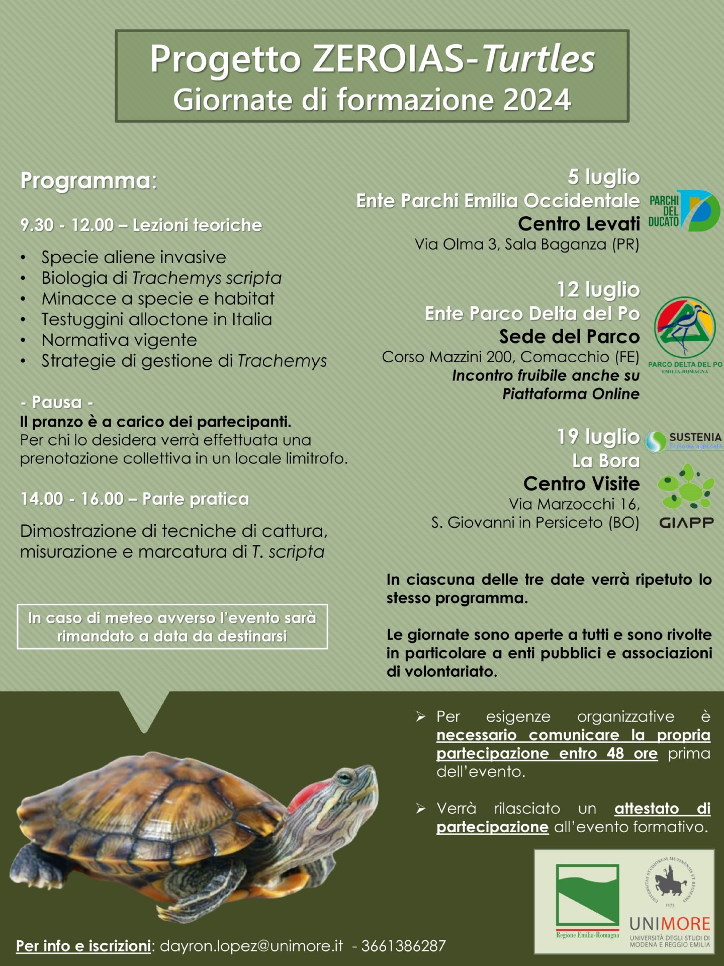 Il Progetto ZEROIAS-Turtles, che vede un accordo di collaborazione tra la Regione Emilia-Romagna e l'Università di Modena e Reggio Emilia, prevede la realizzazione di eventi formativi sulla gestione della specie esotica invasiva Trachemys scripta.
