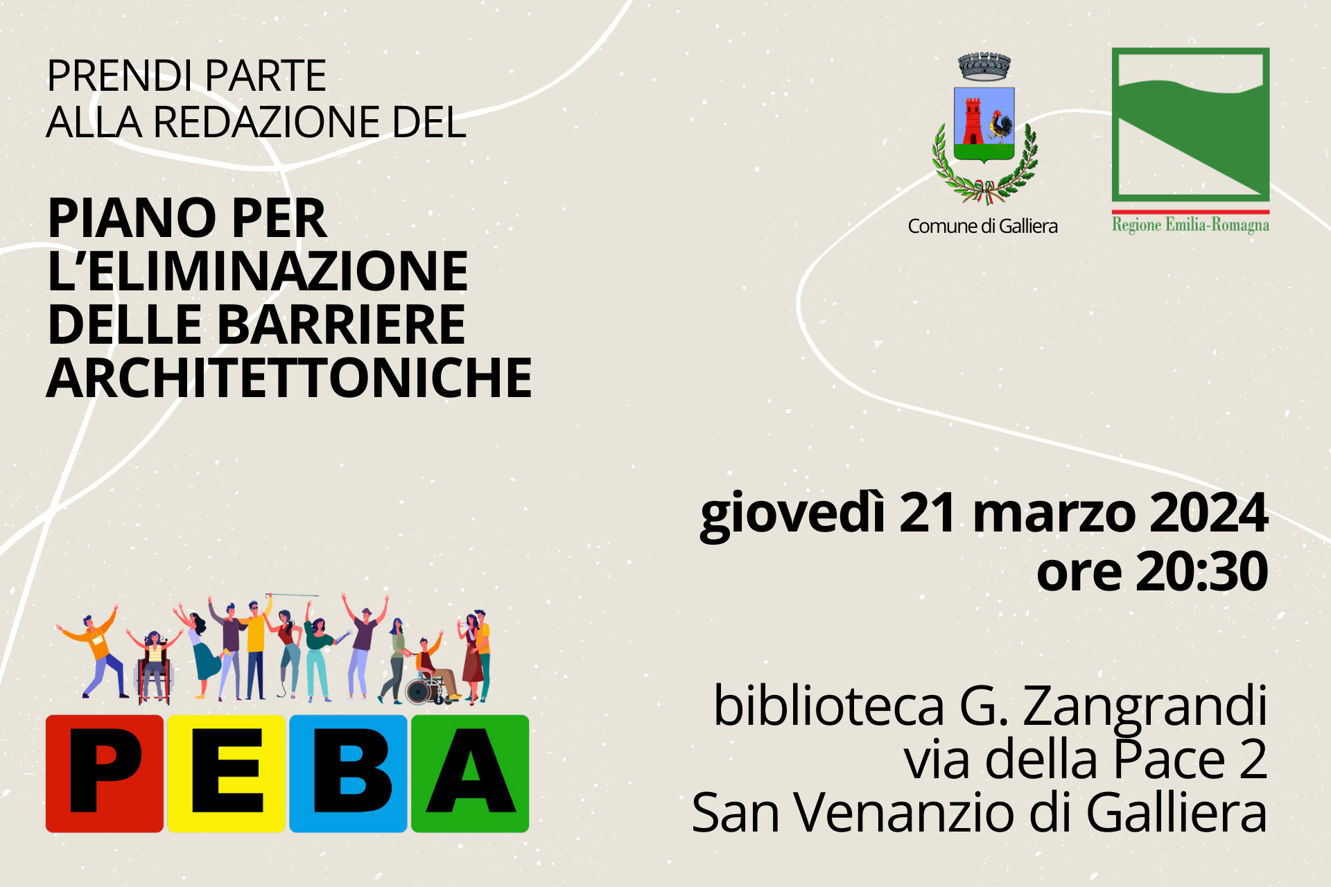 Per questo motivo è nostra intenzione coinvolgere tutti i cittadini nella predisposizione del P.E.B.A. e il primo passo sarà un INCONTRO PUBBLICO Giovedì 21 Marzo alle ore 20:30 presso la Biblioteca G. Zangrandi, in via della Pace 2 a San Venanzio di Galliera.