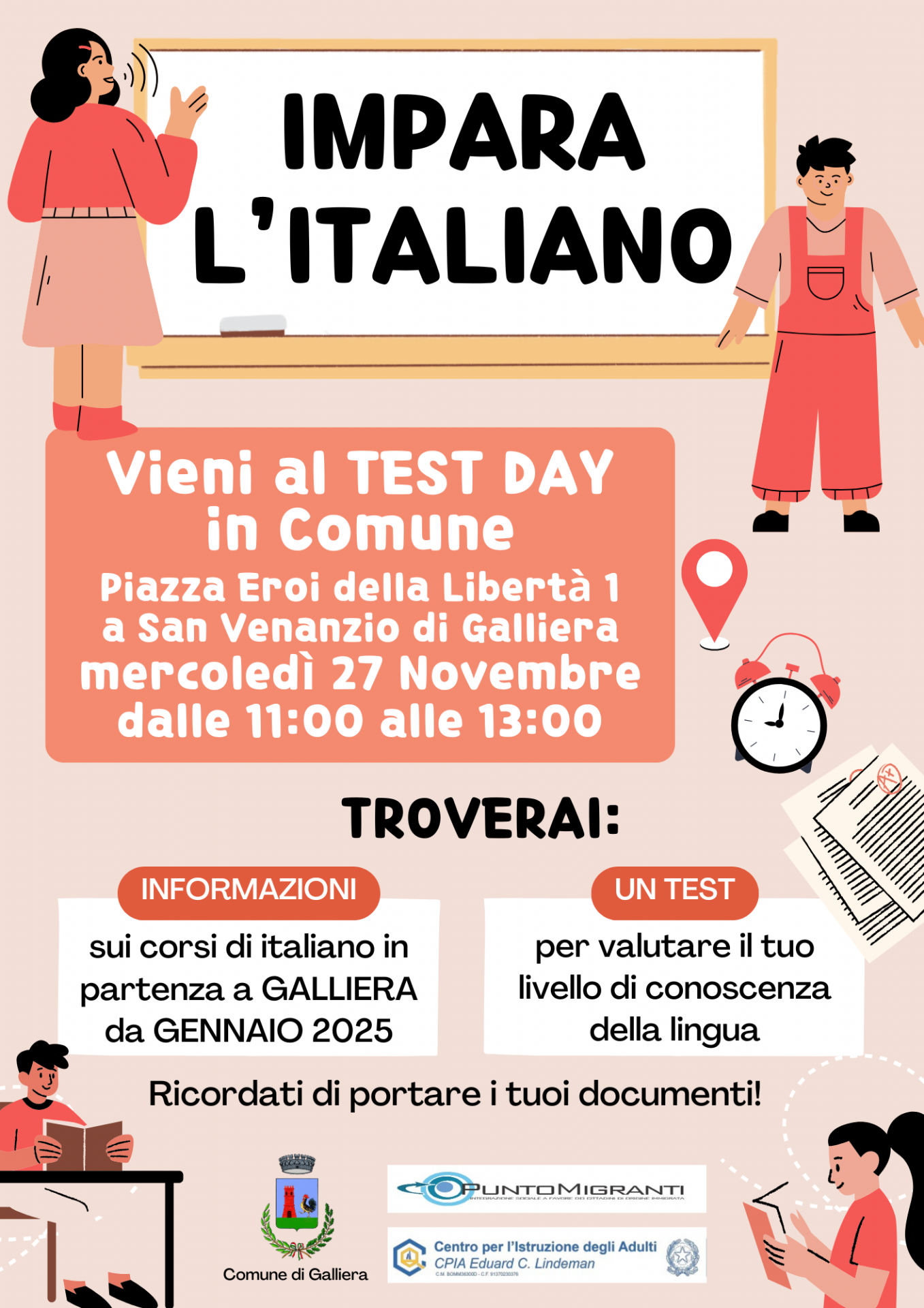Se sei interessato vieni al “TEST DAY” in Comune, Piazza Eroi della Libertà 1 a San Venazio di Galliera, mercoledì 27 novembre dalle 11:00 alle 13:00.